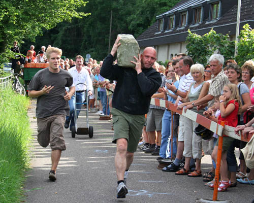 Nahezu ebenso lange wie das Kelterfest wird das historische Steinetragen veranstaltet, das auf eine Legende zurück geht. In diesem Jahr ließ die Zahl der Teilnehmer jedoch zu wünschen übrig: Vier Männer trugen den Wettbewerb unter sich aus; Frauen waren nicht vertreten. Allerdings, wer ist schon drauf erpicht, bei Temperaturen von 35 Grad einen 100-Kilo-Brocken zu schleppen? Neben der Hitze vermuteten die Veranstalter indes einen weiteren Aspekt der Abschreckung für mögliche Interessenten: Die bisher besten Teilnehmer waren einfach zu gut, so dass sich weitere Kandidaten keine Chancen mehr ausrechneten. Deshalb ist geplant, im nächsten Jahr das Steinetragen in zwei Klassen auszutragen – in einer Eliteklasse und einer Amateurgruppe, deren Gesteinsbrocken nur etwa 60 Kilo wiegen soll.